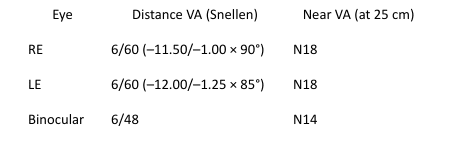 ● Chief Complaint: Progressive reduction in vision since teenage years, difficulty in reading, mobility issues in dim light, and glare sensitivity.