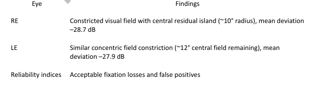 ○ Reports night blindness and peripheral field loss worsening over last 5 years.